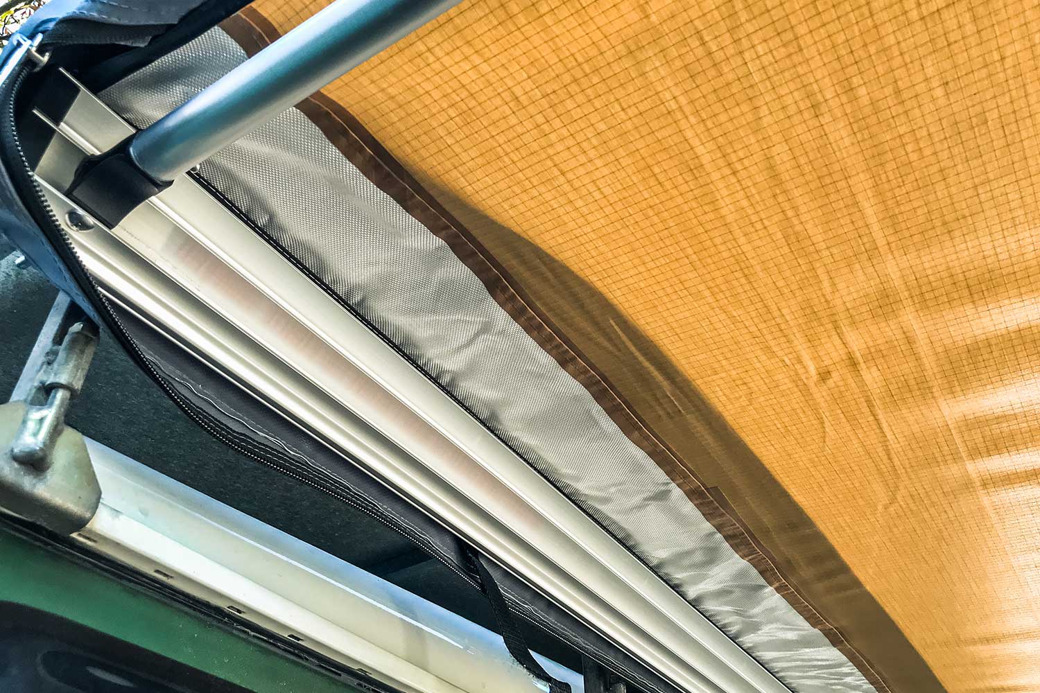 Whilst we’re happy now, we have to admit we were off to a bumpy start with the awning. The first model we bought had some problems with the canvas coating which was coated in lanes instead of continuously. This resulted in a tricky situation when it rained for longer periods. ARB replaced it free of charge, which was a very mentionable service! Although the new awning has a perfect coating, it is still not perfect in our opinion as the sides – which are supposed to line up with the outward extensions – curve inwards and therefore don’t line up properly. However, it hasn’t caused many problems so far.