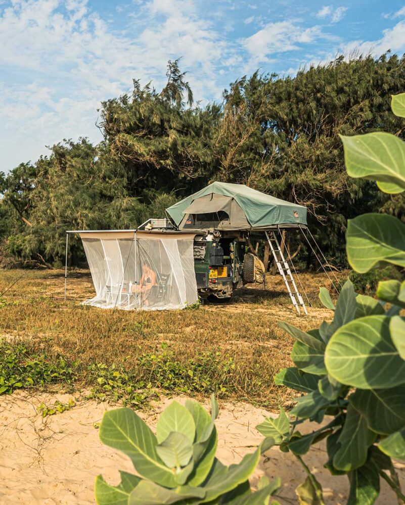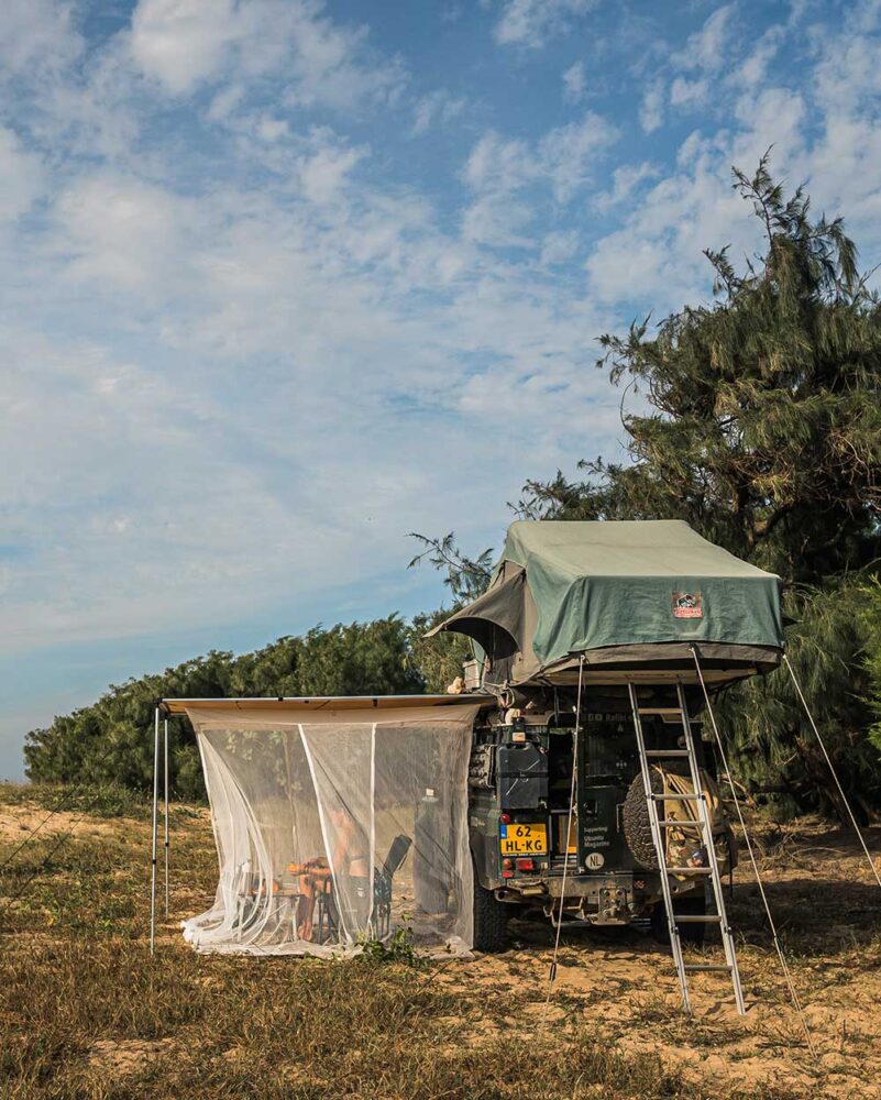 Compared to a dedicated awning room, which is more known to many overlanders, this Bambulah has some advantages and some disadvantages. The Kasih 4D is more versatile than a dedicated awning room, as you can use it over and over again. Even if you decide to pause your overlanding adventure for a while. It is also a lot cheaper, as the current price of the Kasih 4D is € 109,00. It is lighter in weight and most probably less voluminous or difficult to pack than a traditional awning room. One of the absolute advantages of the Bambulah is the spacious vibe it has. As you can open the doors very easily and the mosquito net itself is white, it feels like the canopy isn’t even there when you’re not using it. And, if you do close it, you are less visible to animals so they approach you much more easily. That has been quite the adventure in Senegal, we can say!