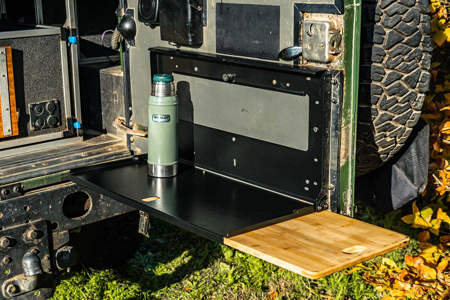 Built from black powder-coated steel with a wooden slide-out cutting board, the dropdown table mounts directly to the inside of the Defender’s rear door, or any other vehicle for that matter. It opens via a latch and is supported by two sliding stays, creating a work surface over 64 centimeters long, plus an additional 44 centimeters with the slide-out board. It’s tough enough to hold up to 40 kilograms, making it suitable for meal prep, repairs, or even as a coffee station (the latter is always a bonus, right?). While it does add some weight to the door, the rigid design and integrated cutting board make it a practical upgrade for anyone wanting to maximize usable space in their Defender.
