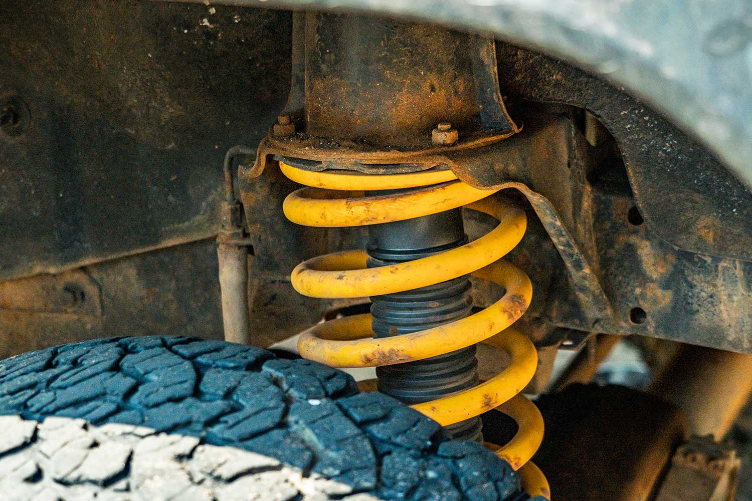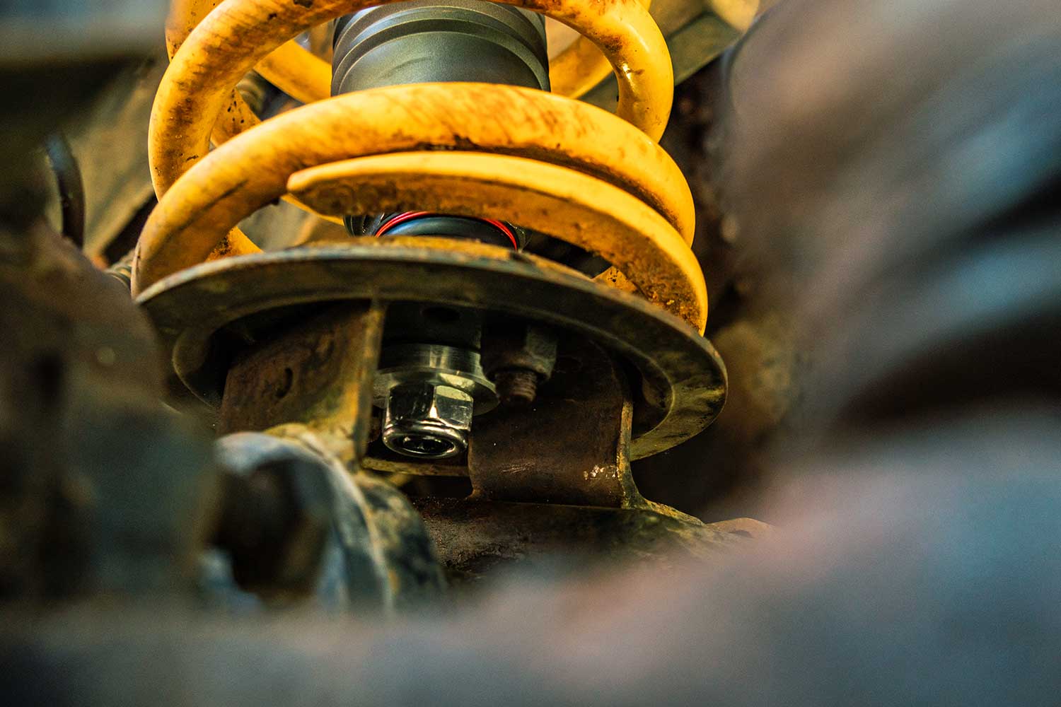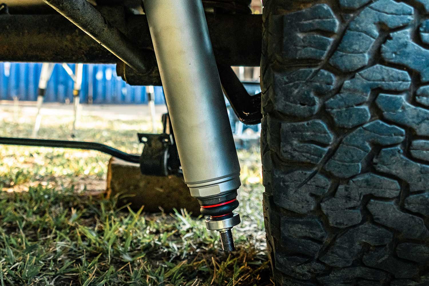 The front was much easier in comparison. We mounted the shock onto the turret and slotted the whole assembly back in place onto its mount. After securing the turret, we loosely put the bottom shock nut on. We then lowered the vehicle slightly, putting pressure on the system so we could tighten everything up. Although the front might sound more complicated, it was way easier as it required less lifting of the vehicle.
