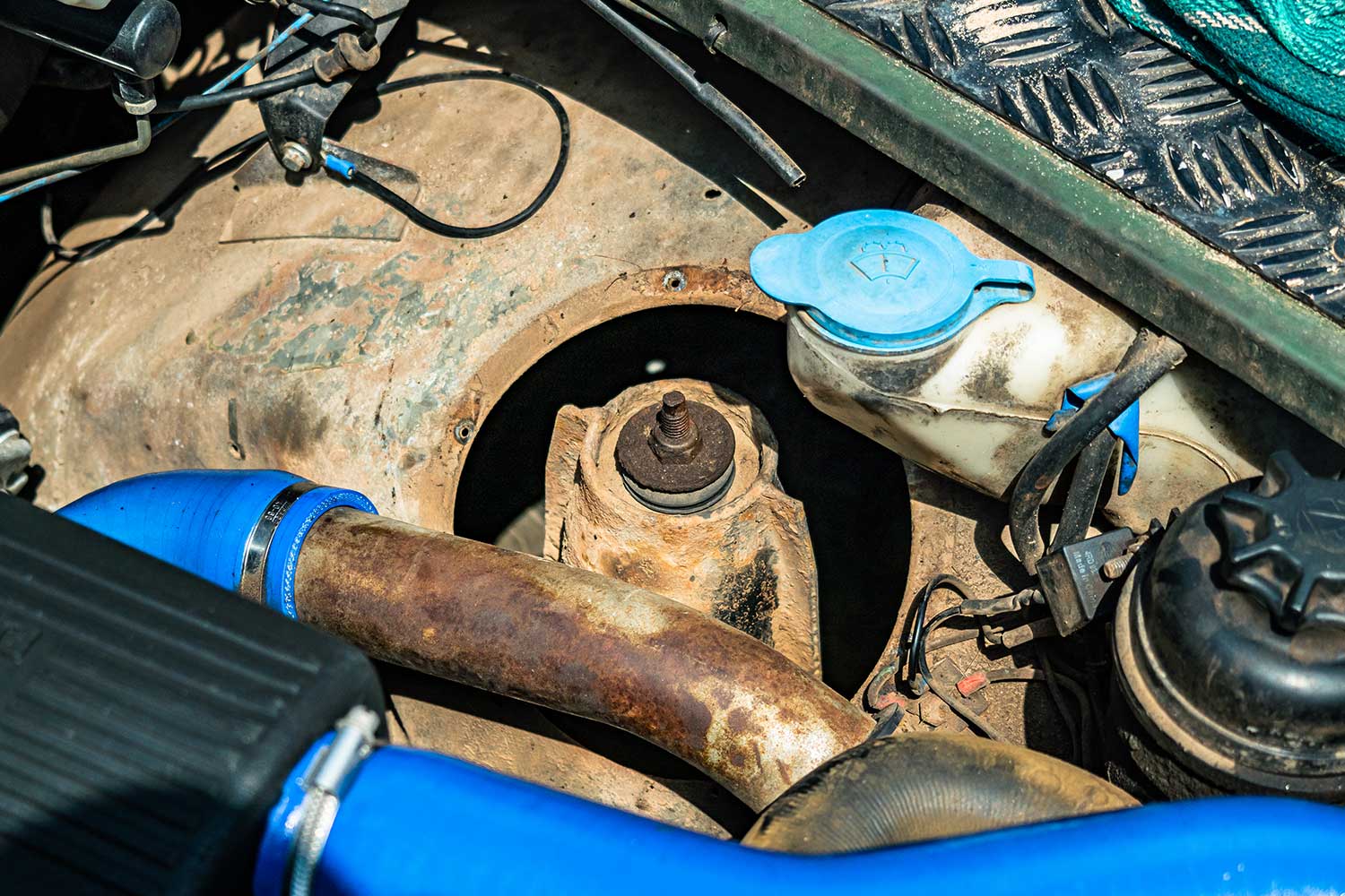 In the front, we removed some components in the engine bay so the shock turrets had space to come out. Our biggest challenge was the lack of a proper spanner to remove the bottom nut. Luckily, with some perseverance, those came off as well, and we could undo the turret nuts and take the whole assembly out via the engine bay. Additionally, the shocks had to be removed from the turrets, which was slightly problematic as everything kept turning. Since we weren’t planning on keeping the old shocks, we just stuck a hammer in there to keep everything in place. It was not how we would have done it if we had a choice, but as we said, we had limited tools and options available.