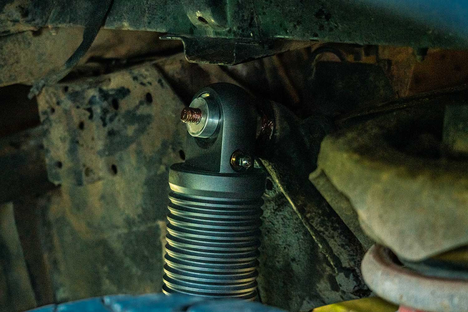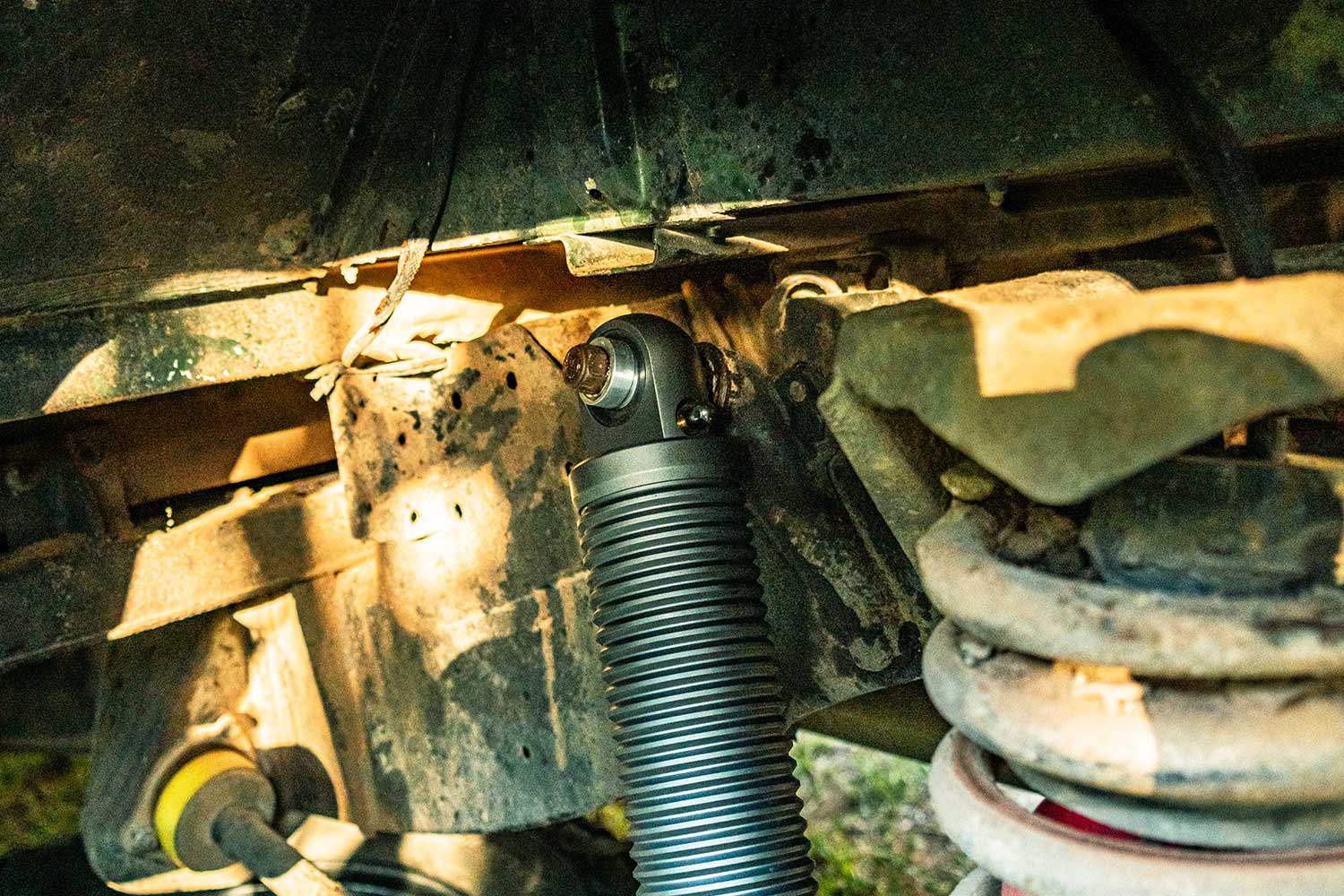 Looking back, the installation at the rear was the hardest, as it required the biggest lift. We installed the rear shocks by inserting the ball joint stud in its mount first, then sliding the top bearing over its mounting bracket. Once everything was in place, we loosely tightened everything up, lowered the vehicle to put pressure on the system, and tightened everything further according to spec (as hard as you can torque it).
