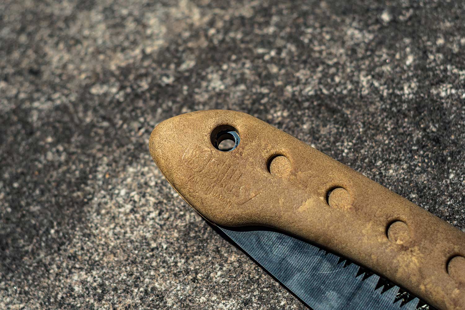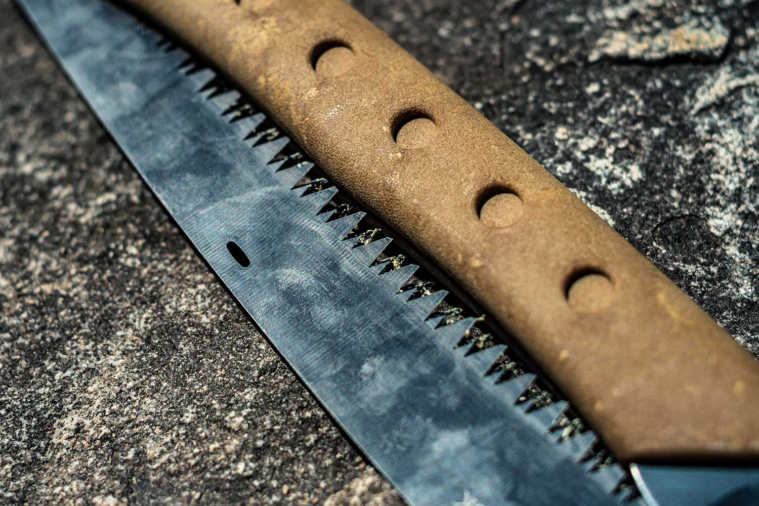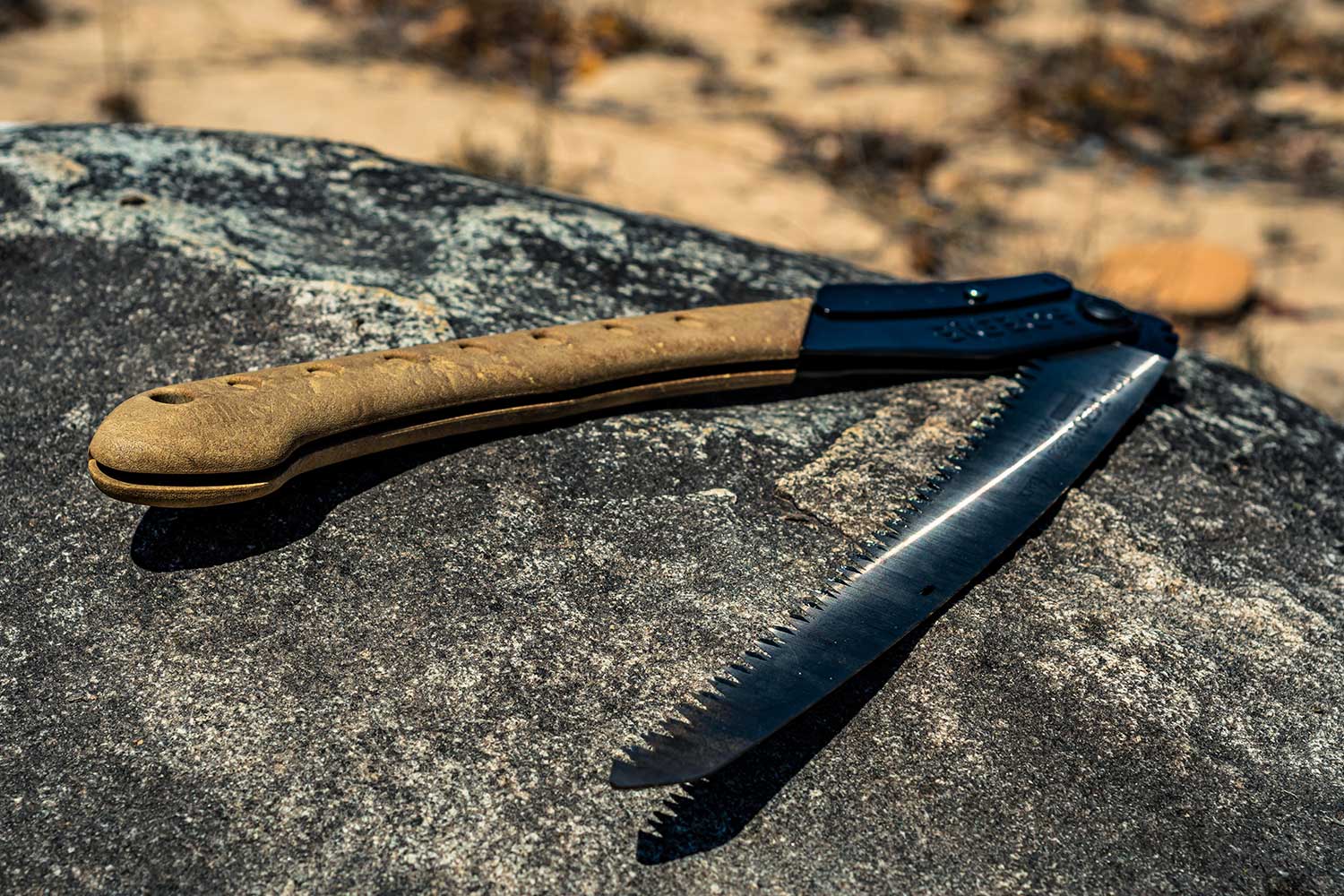 In folded condition the saw is just 40 cm long, neatly being stored in a nylon storage back. When opened a curved blade of 36 centimeters comes out, locking into place thanks to a large and heavy-duty lever. The Outback edition features a composite handle made of a plastic-wood mix, giving the handle a comfortable and warm feel, and providing good grip and superior control of the saw.