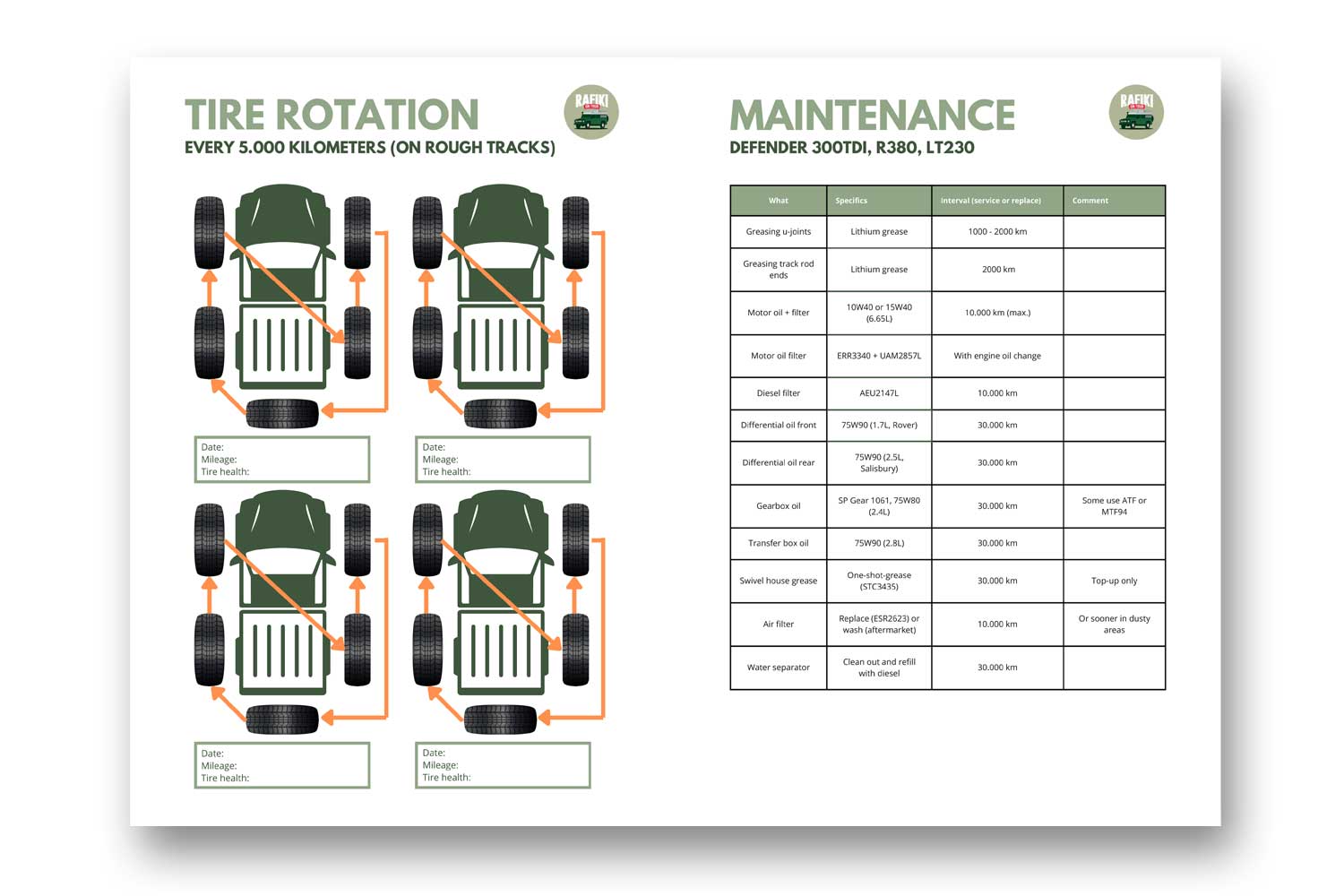 To make it usable for anyone, we have added three different PDF files for general vehicle maintenance. There’s a completed sheet that we use for our Defender (TD5 axles, 300tdi engine), a sheet that mentions the components in need of maintenance, leaving space for your specific oil specification, and a blank sheet to be filled in by you. And then there’s the tire rotation schematics.